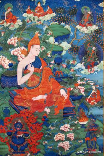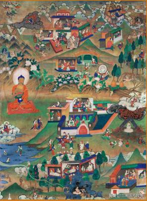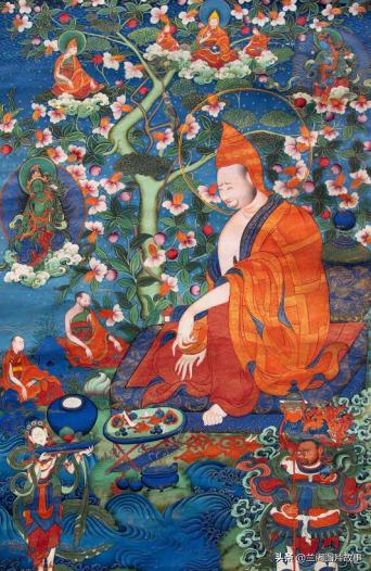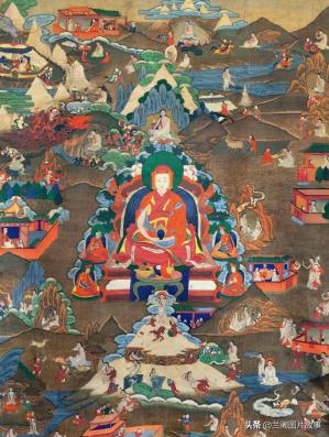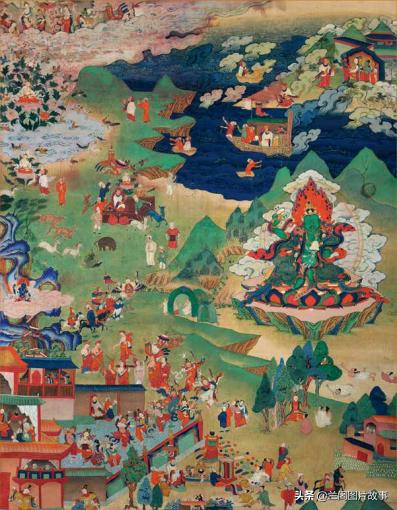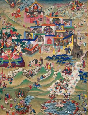 莲花生大师本生传之一,彩绘唐卡,17世纪,西藏昌都地区昌都县拉多乡。(图片来自青岛出版社《唐卡档案昌都卷》)