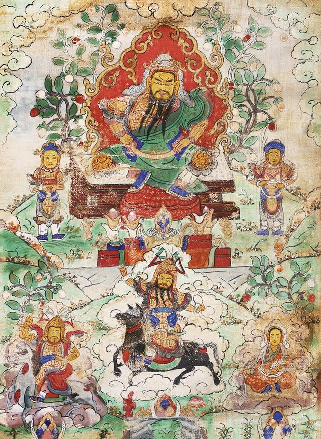 画面下方绘有四位手持法器、 骑乘白马的将军,这四位将军的形象与主尊十分近似,手中分持红缨枪、金刚锤、弯刀、三叉戟等不同法器, 或挥舞兵器,或回头凝望,表情各异,身躯灵动,姿态万千,极富写实意味。