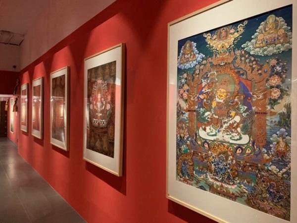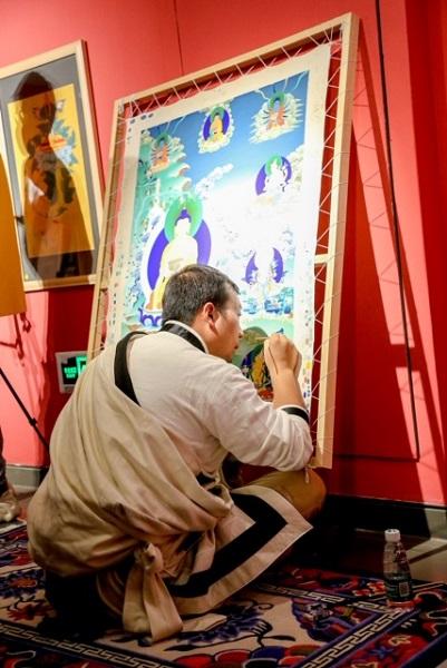 此次展览共展示出娘本先生及其子弟作品48件,涵盖金唐、红唐、黑金、彩唐、黑金带彩、蓝带彩等多种唐卡表现形式。热贡唐卡绘画颜料采用青金石、绿松石、孔雀石、朱砂、黄金等珍贵的宝石级的矿物质颜料和珍珠、珊瑚、鹿角等动物性颜料以及藏红花、栀子、西德等植物为颜料。纯天然的矿物质颜料保证了所绘制的唐卡色泽鲜艳,璀璨夺目,历经千年,依然色泽艳丽明亮。
