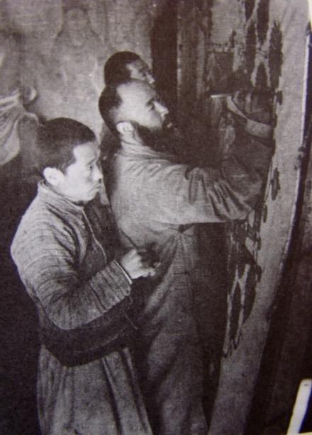 夏吾才郎跟随张大千先生在敦煌莫高窟临摹壁画(更登达吉提供照片)