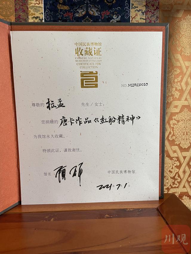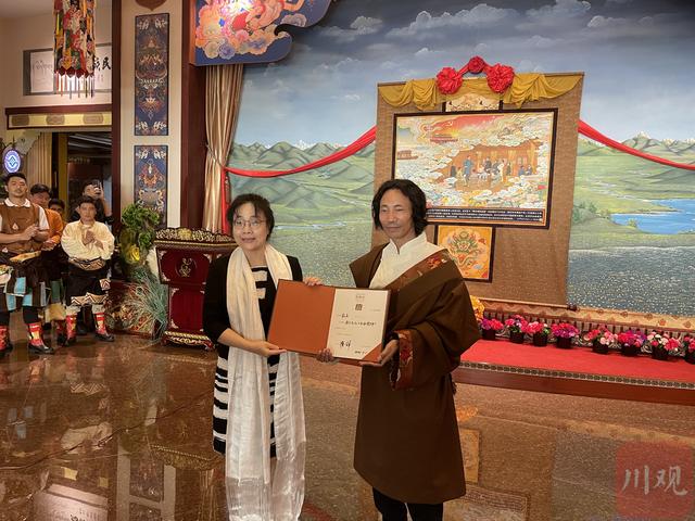 中国民族博物馆副馆长郑茜专程来成都出席了捐赠仪式。郑茜表示,“保护、传承和传播中华民族优秀传统文化是中国民族博物馆的责任所在,能收藏这样一幅既彰显传统技艺又饱含时代气息的唐卡作品,意义非凡。”