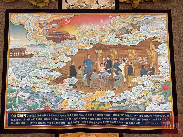 为庆祝中国共产党成立一百周年,深受党和政府关心关怀的拉孟,从去年就开始着手创作《红船精神》,以表达对党的感恩感激之情。拉孟说,“党的政策好,让我从一个牧区的藏族孩子成长为国家级非遗传承人,我想用这样的方式,表达对党的感恩之情。我的学生们也参与了创作和绘制,过程中他们学习党史,汲取红色精神的力量,更加坚定了做中华文化传承者、民族团结推动者和脱贫致富带头者的决心。”