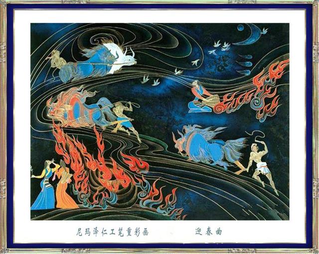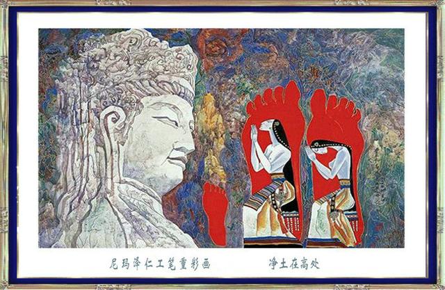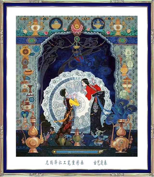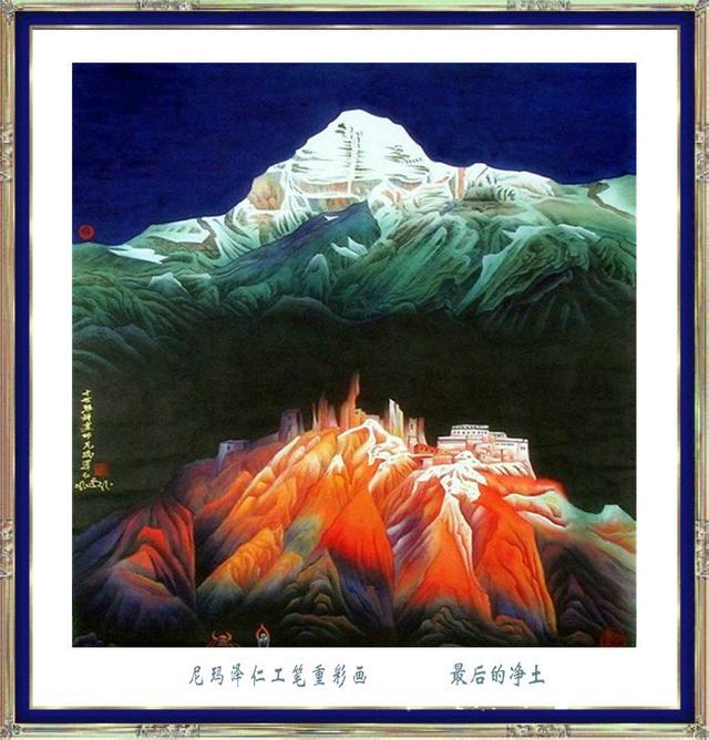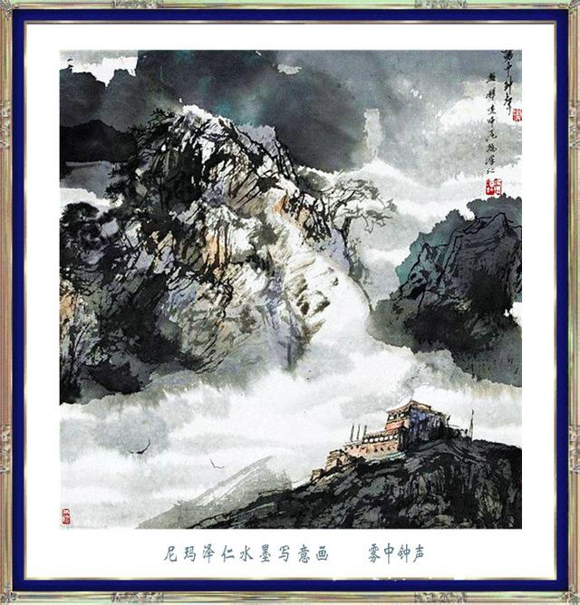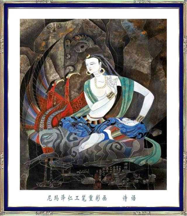 尼玛泽仁的画以工笔重彩为主,同时也作水墨写意画。他的写意画与汉族文人的画不同,具有敦煌遗风,尤其是他表现藏民族精神世界的作品,令人耳目一新。作者通过丰富的水墨层次,透出神秘的灵光,把观赏者带进一个奇幻的境界,使作品具有独特的审美价值。