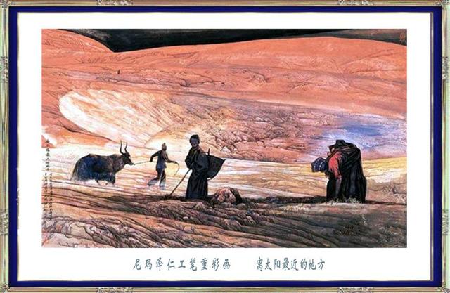 作为一名藏族画家,尼玛泽仁用画笔描绘雪域高原,讴歌藏族人民的美好的生活,他的画具有强烈的历史感和震撼人心的力量。尼玛泽仁的画没有拘泥传统,他花费多 年时间,拜访四川、青海、甘肃、西藏等地的寺庙,拜画僧为师,临摹具有1300年历史并作为藏文化宝库中极其重要的遗产--唐卡画,深入地理解并掌握了传统藏画与唐卡画的构图、色彩、线条、造型等诸多特征,由此创作出具有强烈民族特征的作品。尼玛泽仁在画中保留了藏画色泽鲜明、造型夸张和超时空的特征,融汇了中国画的线条和西方艺术的立体造型手段,拉开了与传统唐卡画之间的距离。尼玛泽仁在画中还借用了西画的笔法,以金黄色为主调,在光影的斑驳中凸现空间的立体感,使他的画面风格既非传统藏画,也非传统汉画,更不是西画,而是三者皆而有之。