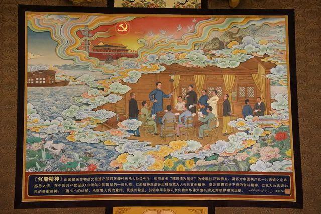 为庆祝中国共产党成立一百周年,深受党和政府关心关怀的拉孟,从去年就开始着手创作《红船精神》,以表达对党的感恩感激之情。拉孟说:“党的政策好,让我从一个牧区的藏族孩子成长为国家级非遗传承人,我想用这样的方式,表达对党的感恩之情。我的学生们也参与了创作和绘制,创作中他们学习了党史,汲取了红色精神的力量,更加坚定了做中华文化传承者、民族团结推动者和脱贫致富带头者的决心。”