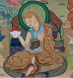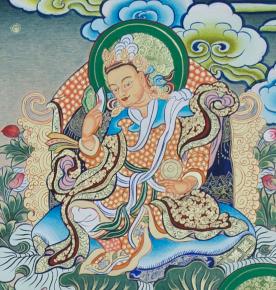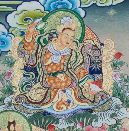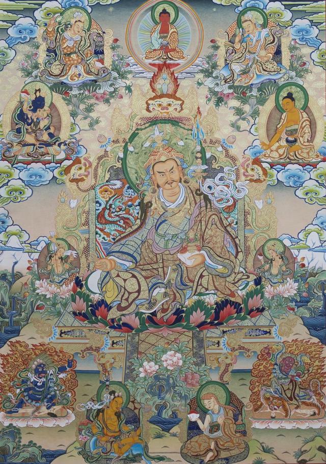 唐卡正中主尊:莲花生大师,他是藏密的开基祖,亦是藏传佛教宁玛派的祖师。身侧左右为莲花生大师的两位佛母曼达拉娃,益西措杰。