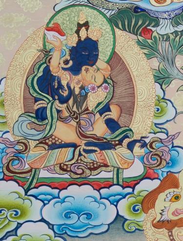 身现蓝色,拥抱白色明妃,金刚盘腿坐姿,明妃左手托装满甘露的颅碗,双脚缠绕父尊。藏史云:印度西方邬丈那国,国王因扎菩提膝下无子,因其乐善好施,不时供养三宝,故国库空虚,派国中大臣兹拉尊往海中寻宝,于达喇郭啸海见莲师降生于莲花上,将之抱回由国王抚育为太子,赐名为“莲花生”或“海生金刚”。