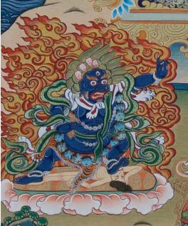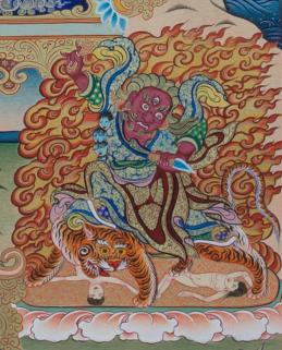 是莲花生大师的忿怒化现,译为金刚力士。一面二臂三目,身体呈棕红色,面相忿怒,三目圆睁,张开大口,獠牙锋利,右举天铁金刚杵,左持普巴撅,骑于母虎之背,虎足下踏两魔,象征消除一切违缘障碍,降服一切魔障。威立于莲花日轮之上,安住般若烈焰之中。莲花生大士降伏了奸臣之子,国王将其流放到尸陀林。他在不同的尸陀林中,为人说法,对那些无缘佛法,有着邪知邪见的鬼神,以忿怒金刚的形象全部降伏。