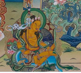 莲花生大师莲座下从左至右依次为,狮子吼声(Senge Dradrog),日光上师(Nyima Oser),莲花生上师(Guru Padmasambhava),忿怒金刚上师(Dorje Drollo)
