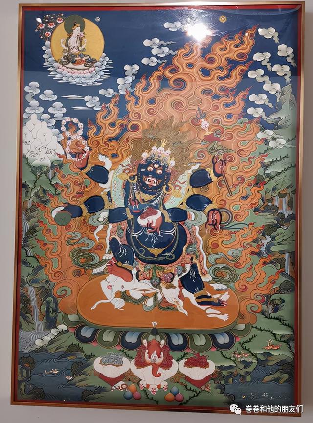 最令我感动的还是唐卡内容上对传统的坚持。大黑天、明飞、颅器等在我看来颇有些邪性,或者说野性,或者说生机勃勃的传统元素一样不少,很好地满足了我的恶趣味。