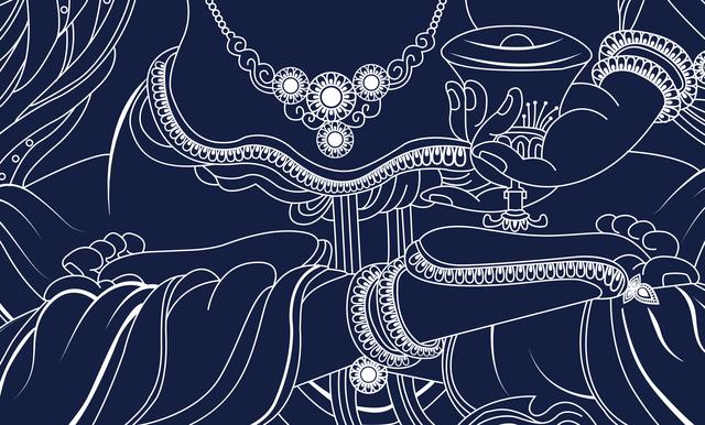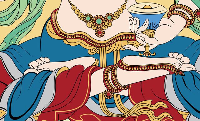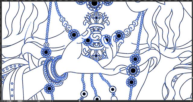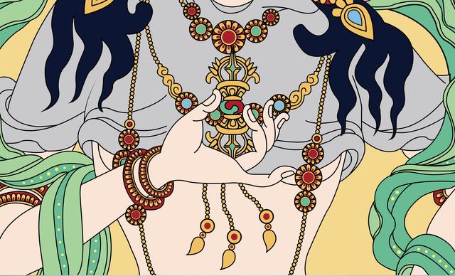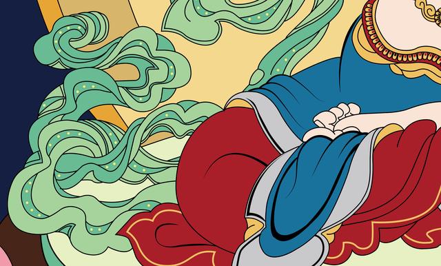 唐卡画面是一个有机整体,不能光是孤零零地放上一些神灵人物,还需要一些细节将他们联系起来。莲座、光背、祥云、花蔓以及其他装饰纹样等都能很好地起到这样的作用。尤其在那些受到汉地绘画影响的唐卡作品中,金碧山水与奇花异草是最常见的背景装饰题材。同时,这些装饰也有着一定的宗教含义。例如,在表现佛国净土时,琼楼玉宇、宝池净莲与灵鸟都是不可或缺的。唐卡画面.上还会有一些小小的点缀,例如表示美好寓意的七宝、八吉祥,位于本尊下方、表现对他的敬意的供品等等。唐卡艺术发展到今天,流派众多,新人辈出,技法不断出新,作品异彩纷呈,广受海内外人士的喜爱,被誉为我国民族艺术的奇葩。