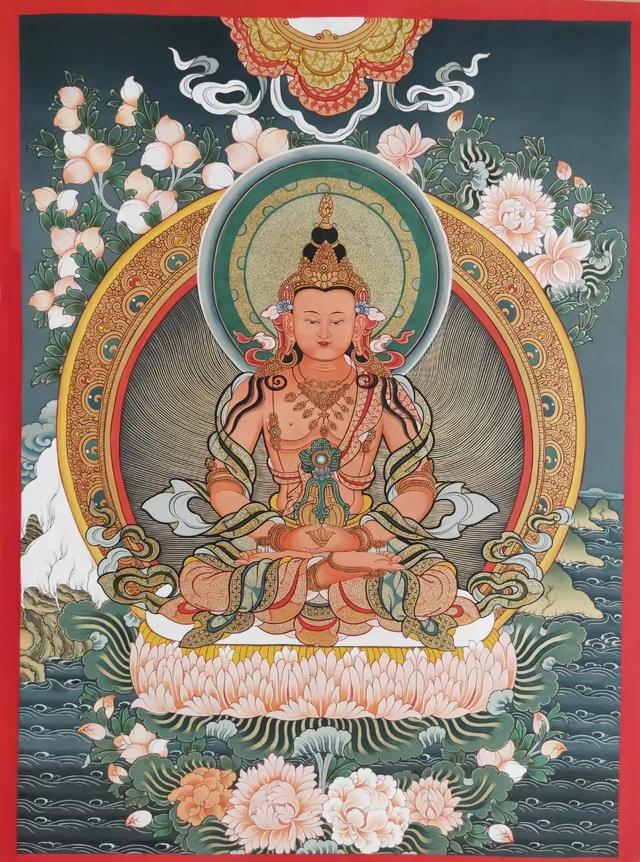 扎西尖措作品【长寿佛】画芯尺寸70×50cm,幅面主尊庄严凸显,整幅唐卡画工精湛,线条细腻流畅,调色晕染水准极高,主尊以及幅面其他佛菩萨开脸极为殊胜,唐卡中主尊长寿佛巨大居中,脸型长圆中间方正,两目下垂如弓,其背光和蹄行头光中均绘满卷草纹,纹路线条飘逸灵动,笔法精湛,侍立主尊两边的菩萨肤色一白一红,长臂宽掌,头戴五佛冠,下肢着暗花透明纱裤,莲座两排上排宽下排窄,上下翻合,其造型上的美质及制作上的精良可称得上当世巅整幅唐卡艺术的最高水准,是具有收藏价值与艺术研究价值的一幅唐卡而且仅此一幅,现为孤品,喜欢就不要错过。