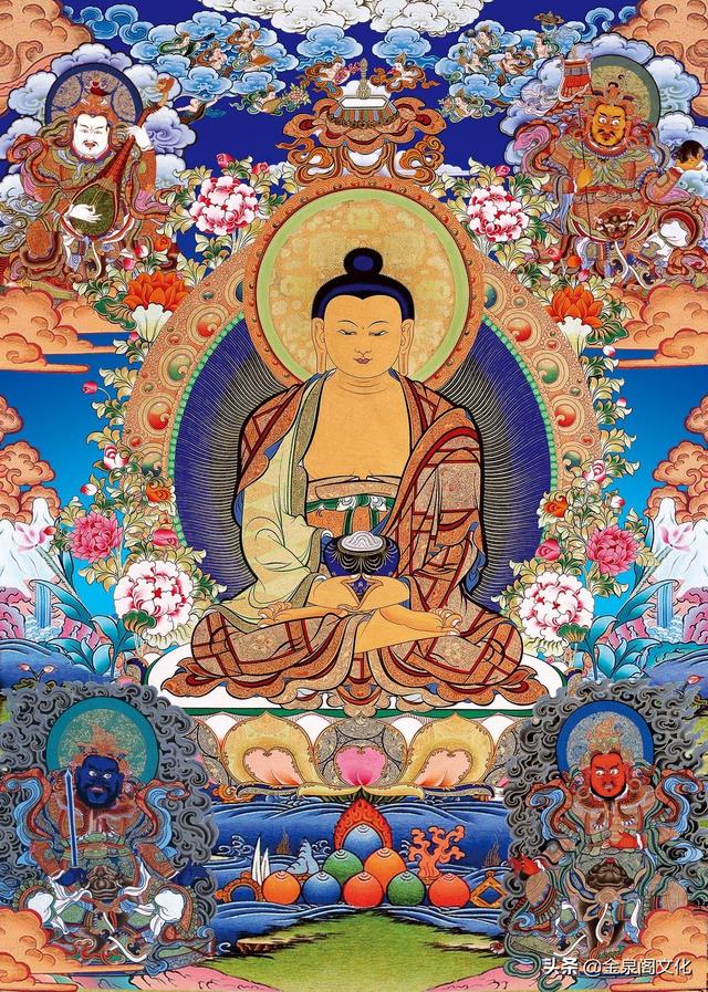 《阿弥陀佛》金雕彩绘唐卡画面中的主尊为阿弥陀佛。佛祖螺发高髻,面相慈和,双手托钵,身着金色袈裟,身后背光华美端庄,结跏趺坐五彩莲花宝座,现禅定相。座前设案,纷陈各种供养,东西南北四方分侍象征“风调雨顺”的四大天王:南方增长天王,手握宝剑,司风,以护佑佛法;东方持国天王,手持琵琶,司调,以感化众生;北方多闻天王,右手持宝伞(又称宝幡),左手握银鼠,司雨,以增加和守护财富;西方广目天王,左手挚宝塔,右手缠绕一龙(或蛇),司顺,以护持众生。整个画面金碧辉煌、安静祥和!