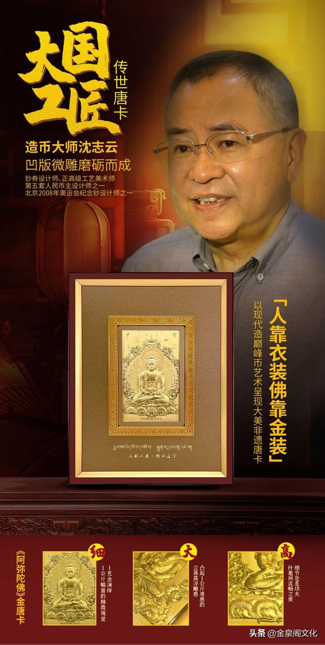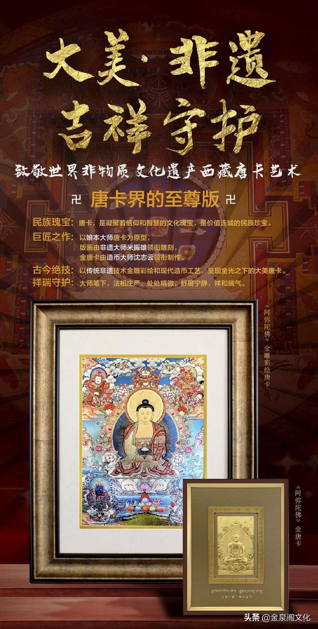 两大世界非遗工艺唐卡、金雕彩绘首次联合雕琢而成的大美之作:以娘本《阿弥陀佛》唐卡为创作蓝本;米振雄老师以“米氏刀法”领衔,12种刀法、百道工序、文物保护特色技艺演绎而出;这幅唐卡是两位大国工匠的开山之作,对唐卡顶级作品的还原,又有独一无二的手工技艺,无法复制,使得每幅唐卡都有独特的珍藏价值,可谓一画难求,出品数量极为有限;