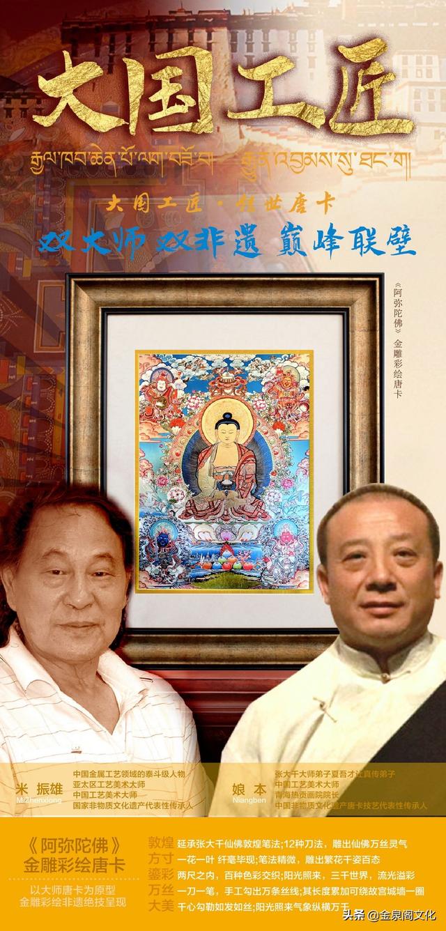两位大国工匠娘本、米振雄联袂打造:娘本大师,中国工艺美术大师,国家非物质文化传承人、青海热贡画院院长,将唐卡带入世界顶级艺术博物馆美国大都会;米振雄大师,被誉为“国礼圣手”,一代泰斗,米老师创作了许多当代工艺珍品,作品被多次作为国礼赠送给外国元首等政要;