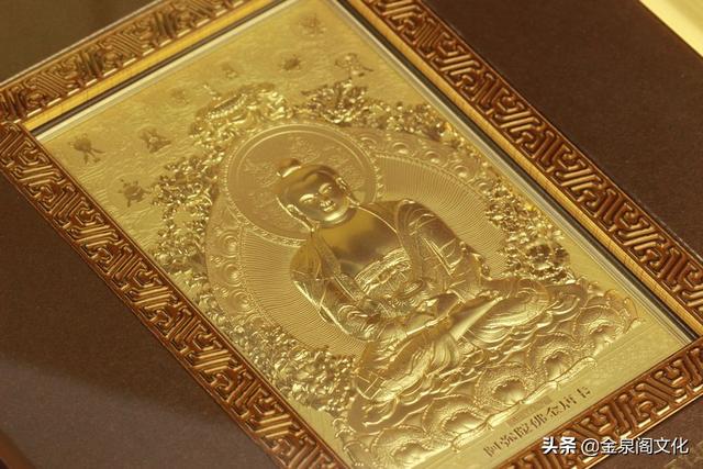 阿弥陀佛金唐卡画面中的主尊为阿弥陀佛。佛祖螺发高髻,面相慈和,双手托钵,身着金色袈裟,身后背光华美端庄,结跏趺坐莲花宝座,现禅定相,周围由佛教八宝点缀。画芯85*130mm;画框230*300mm,画芯材质为足金999,克重1g。